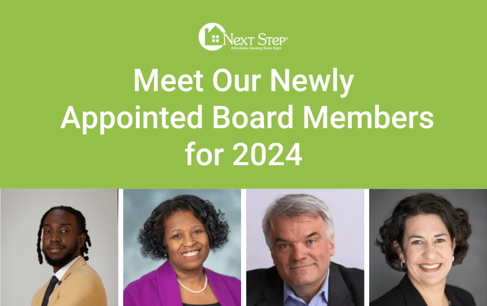 January 31, 2023 – Next Step is pleased to announce the appointment of Adonis Logan of Inclusive Capital Partners, Arica Young of Lincoln Institute of Land Policy, Doug Ryan of Prosperity Now, and Sarah Kackar of NeighborWorks to Next Step Network’s Board of Directors.
